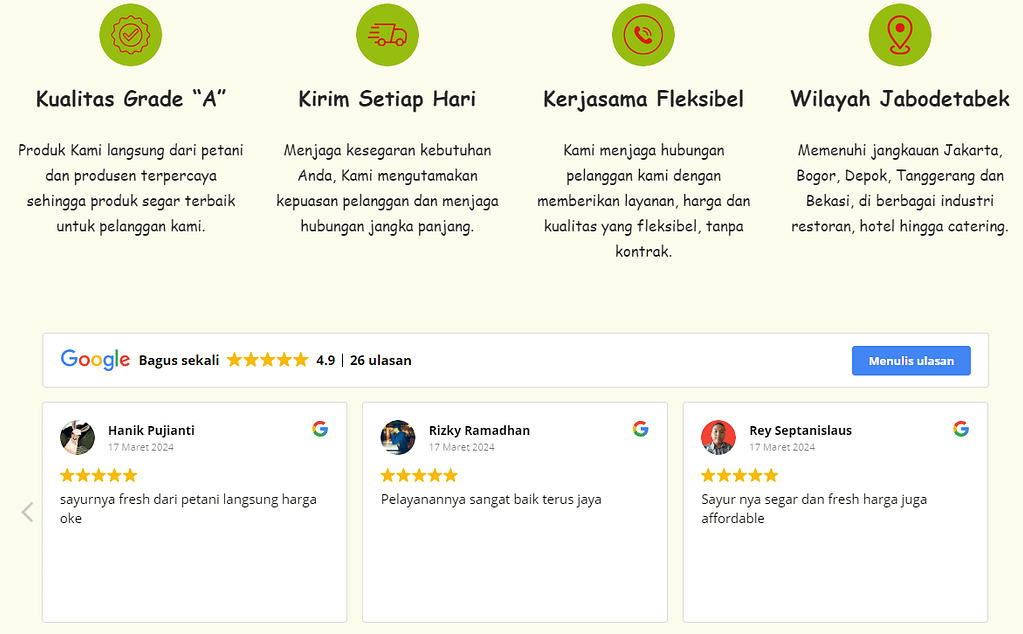 Kesegaran produk dan waktu adalah dua hal yang tidak dapat dipisahkan. Cara lain dalam memilih pemasok unggulan yakni melihat ulasan dari segi ketepatan waktu pengiriman, alangkah baiknya pilih pemasok yang mengirimkan sayur beberapa jam setelah anda melakukan pemesanan supaya produknya tetap segar.